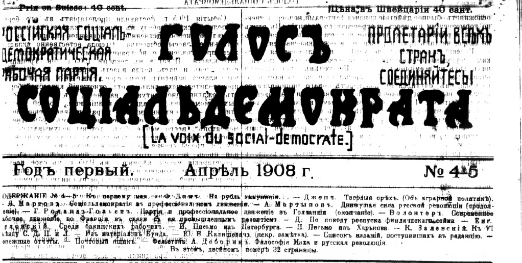 This text came out in the newly established Menshevik newspaper called Golos sotsialdemokrata (The voice of the Social-Democrat) in April of 1908 (№4-5) on pages 3 to 12 (bottom part of the pages).